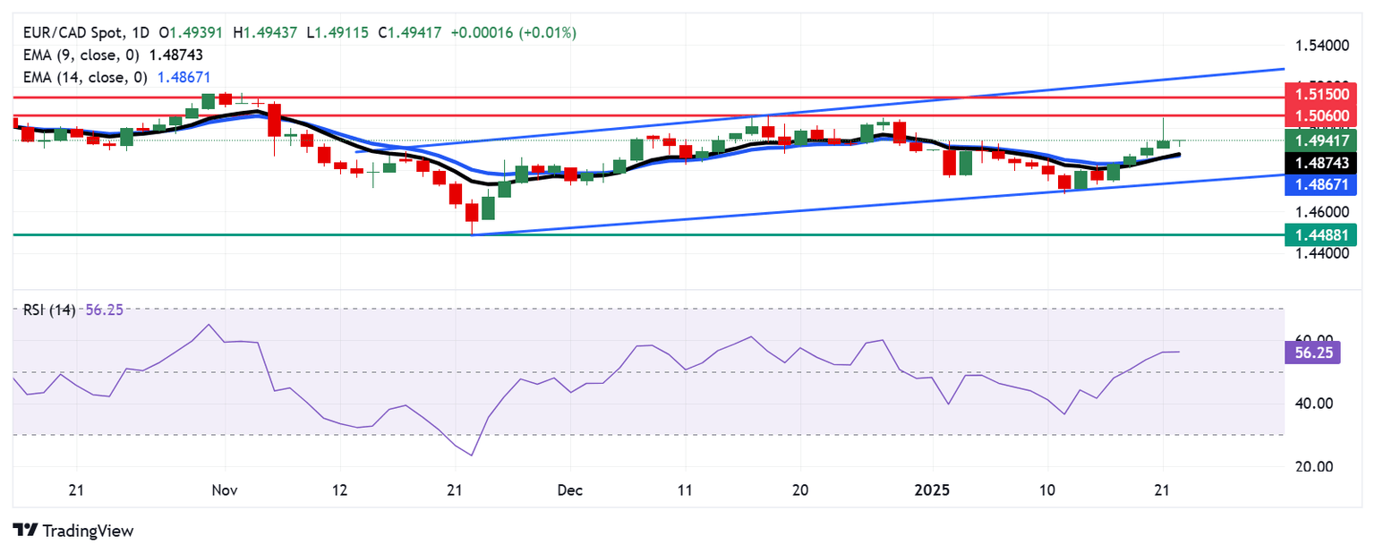 El EUR/CAD pone fin a su racha de cuatro días de pérdidas, cotizando cerca de 1.4940 durante las horas de negociación europeas del miércoles. El análisis técnico en el gráfico diario apunta a un sesgo alcista, con el cruce de divisas continuando su cotización dentro de un patrón de canal ascendente.