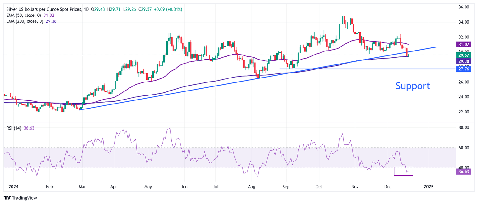 El precio de la Plata cae cerca de la media móvil exponencial (EMA) de 200 días, que se negocia alrededor de 29.40$. El metal blanco se debilitó después de romper por debajo del mínimo de noviembre de 29.65$. El activo también ha probado la línea de tendencia ascendente alrededor de 29.50$, que se traza desde el mínimo del 29 de febrero de 22.30$.