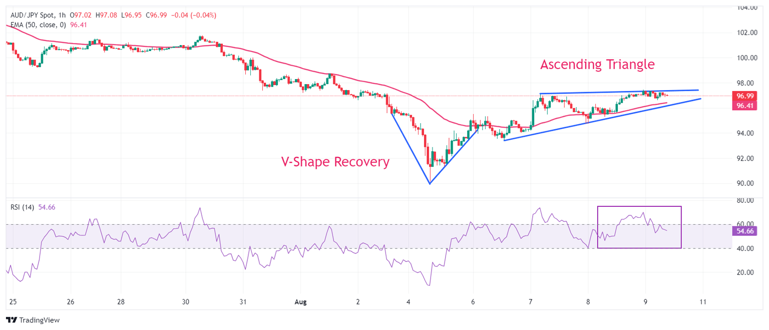 El AUD/JPY oscila en un patrón gráfico de Triángulo Ascendente en un marco temporal horario, lo que muestra una fuerte contracción de la volatilidad. La media móvil exponencial (EMA) de 50 horas cerca de 96.40 sigue proporcionando soporte a los alcistas del Dólar australiano. Anteriormente, el activo entregó una recuperación en forma de V después de registrar un nuevo mínimo anual cerca de 90.00.