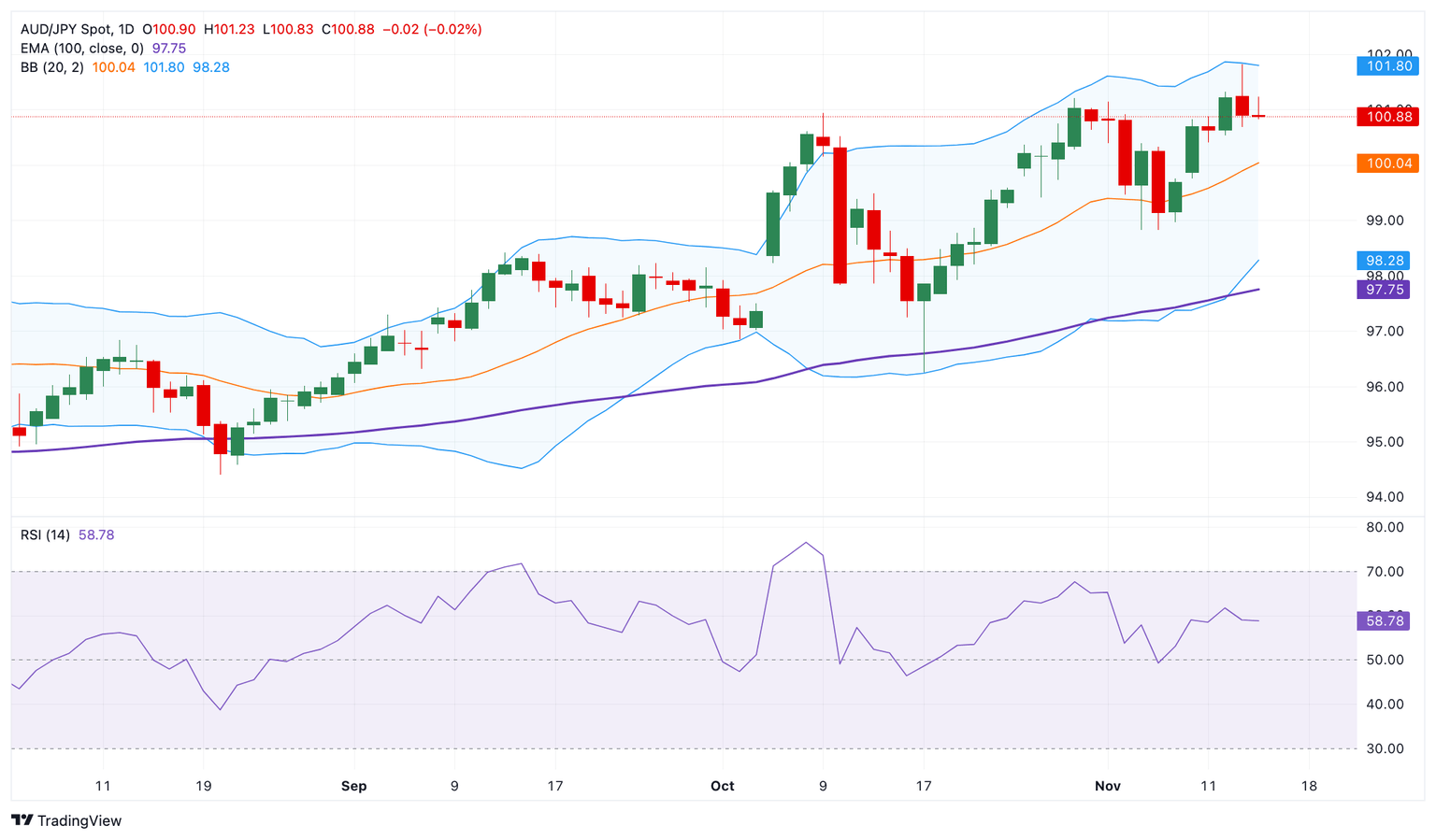 El cruce AUD/JPY opera en territorio negativo cerca de 100.85 durante la sesión europea temprana del viernes. El potencial a la baja para el Dólar Australiano (AUD) podría ser limitado debido al fuerte mercado laboral, lo que sugiere que el Banco de la Reserva de Australia (RBA) probablemente mantendrá las tasas de interés en espera por ahora.