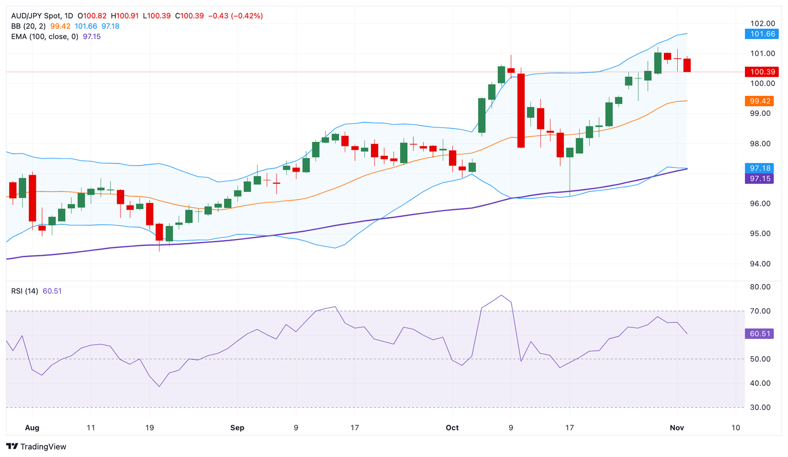 El cruce AUD/JPY atrae a algunos vendedores cerca de 100.50 durante la sesión europea temprana del martes. El Dólar australiano (AUD) se debilita frente al Yen japonés (JPY) después de que el Banco de la Reserva de Australia (RBA) decidiera mantener la Tasa de Efectivo Oficial (OCR) estable en 3.6% en la reunión de política monetaria de noviembre. Esta decisión fue en gran medida anticipada tras una lectura de inflación más alta de lo esperado en el trimestre de septiembre.