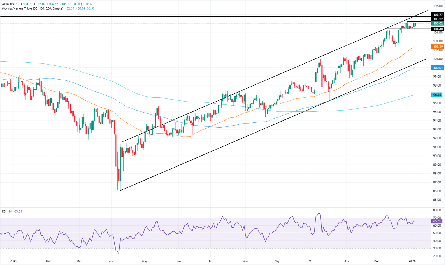 La imagen técnica revela que la tendencia alcista en el AUD/JPY se mantiene intacta, confirmada por un índice de fuerza relativa (RSI) en aumento en convergencia con la acción del precio. El RSI está en 65.20 con la pendiente mostrando signos de que los alcistas están a cargo, mientras que el par sigue siendo tímido para romper el máximo del año pasado en 105.22.