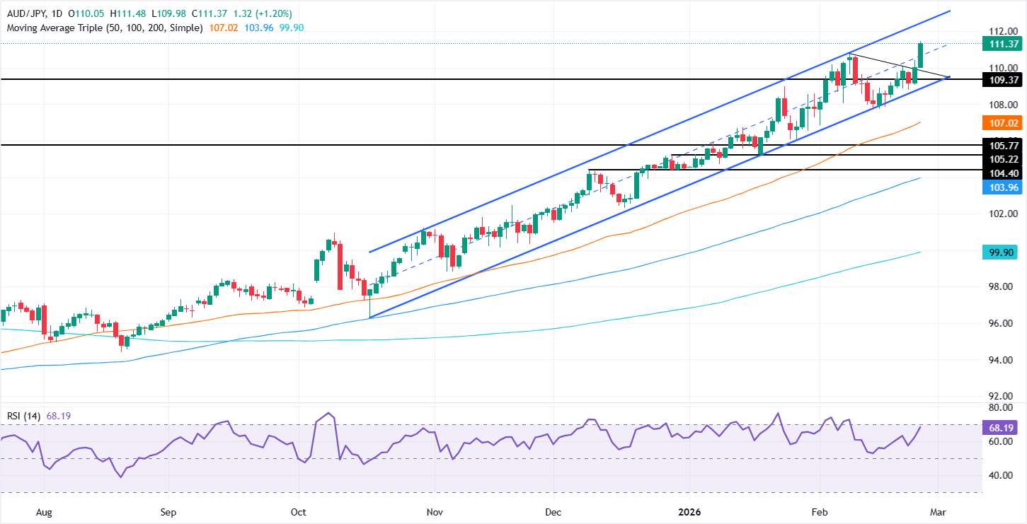 Si el AUD/JPY retrocede por debajo de 111.00, se abre la puerta para probar el máximo del ciclo del 10 de febrero de 110.67, seguido de la media móvil simple (SMA) de 20 días en 109.34. En caso de mayor debilidad, la próxima parada sería una línea de tendencia de soporte clave trazada desde los mínimos de noviembre de 2025, alrededor de 108.00.