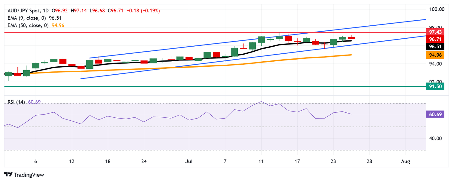 Pronóstico del Precio del AUD/JPY: Se mantiene por debajo de 97.00, el soporte aparece en la EMA de nueve días