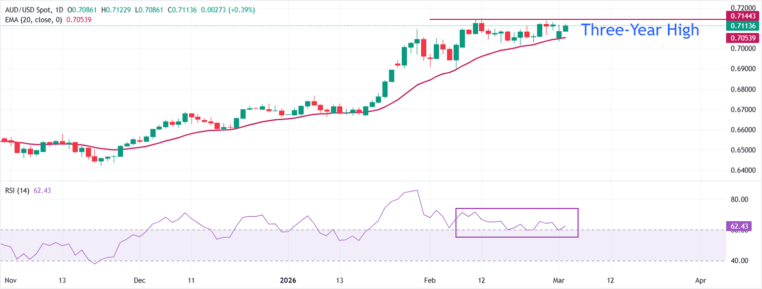 El AUD/USD sube a cerca de 0.7110 en el comercio asiático. El sesgo a corto plazo es alcista ya que el precio se mantiene por encima de la media móvil exponencial (EMA) de 20 días en ascenso, que respalda una secuencia de cierres más altos observados en las últimas semanas. El par se está consolidando justo por debajo de los máximos recientes, sugiriendo una pausa en lugar de una reversión, mientras que la EMA de 20 días continúa siguiendo por debajo del precio al contado.