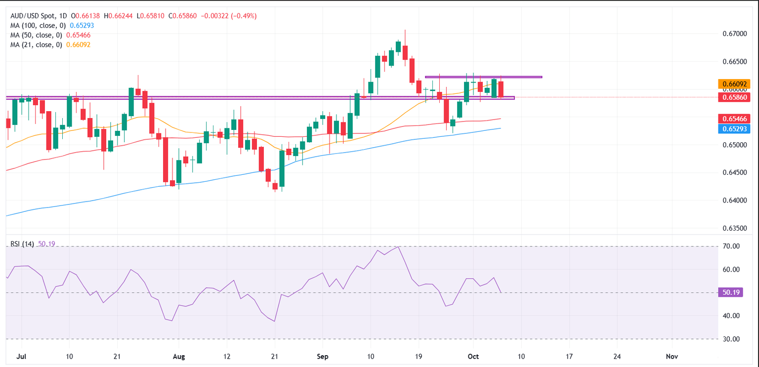 El Índice de Fuerza Relativa (RSI) en el gráfico diario se sitúa cerca de 51, indicando condiciones ni de sobrecompra ni de sobreventa. Si bien la reciente fortaleza del Dólar estadounidense podría resultar efímera en medio del prolongado cierre del gobierno de Estados Unidos (EE.UU.) y el aumento de las expectativas de recortes adicionales de tasas de interés por parte de la Reserva Federal (Fed), cualquier retroceso en el Dólar probablemente mantendrá contenida la caída en el AUD/USD. Al mismo tiempo, la postura cautelosa del Banco de la Reserva de Australia (RBA) sobre un mayor alivio de la política monetaria proporciona una capa adicional de soporte.
