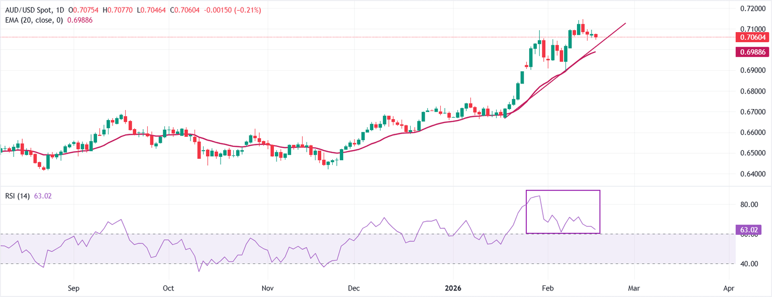 El AUD/USD cotiza a la baja alrededor de 0.7060 al momento de escribir. El precio se mantiene por encima de la media móvil exponencial (EMA) de 20 días en 0.6989, reforzando un sesgo alcista. La EMA de 20 días tiene una pendiente ascendente, reflejando un impulso alcista sostenido.