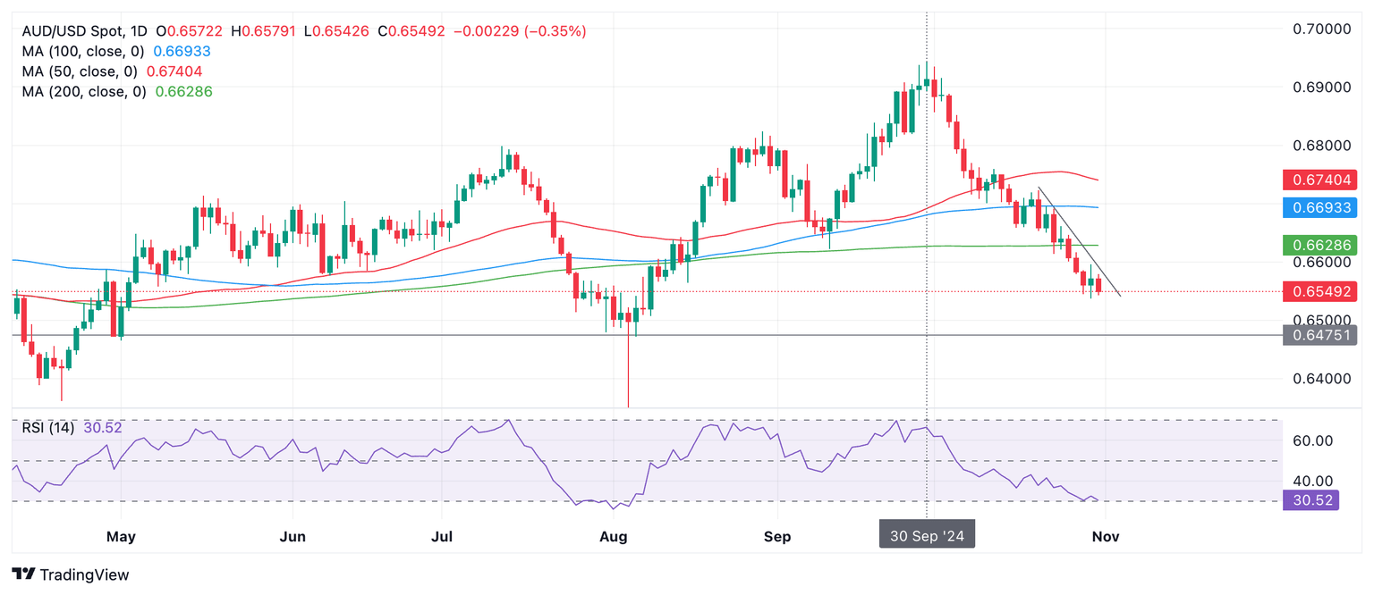 El AUD/USD continúa su caída de octubre tras un breve retroceso. El par está en una tendencia bajista a corto y medio plazo que, dada la máxima técnica de que "la tendencia es tu amiga", probablemente se extienda hacia el sur.