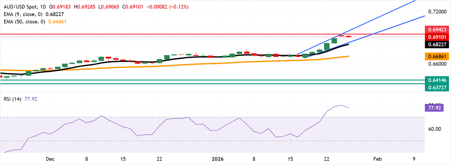 Pronóstico del Precio del AUD/USD: Manteniendo la posición cerca de 0.6900 debido a las condiciones de sobrecompra