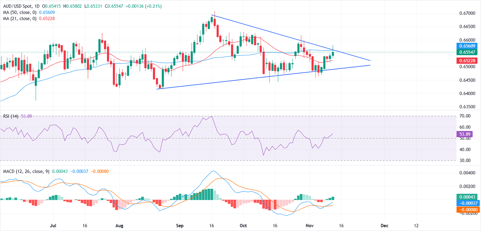 Desde una perspectiva técnica, el AUD/USD continúa cotizando dentro de un triángulo simétrico bien definido en el gráfico diario. El retroceso del jueves se produce después de que el par probara brevemente la resistencia de la línea de tendencia descendente, que se alinea estrechamente con la Media Móvil Simple (SMA) de 50 días cerca de 0.6560.