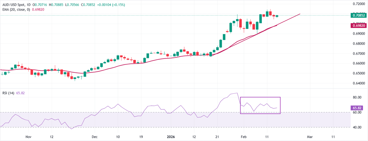 En el gráfico diario, el AUD/USD cotiza a 0.7085. La media móvil exponencial de 20 días sube, ahora en 0.6982. Los retrocesos han sido apoyados por encima de este nivel dinámico, manteniendo el sesgo a corto plazo positivo. El RSI en 66 permanece en territorio alcista sin estar sobrecomprado, confirmando un fuerte impulso.