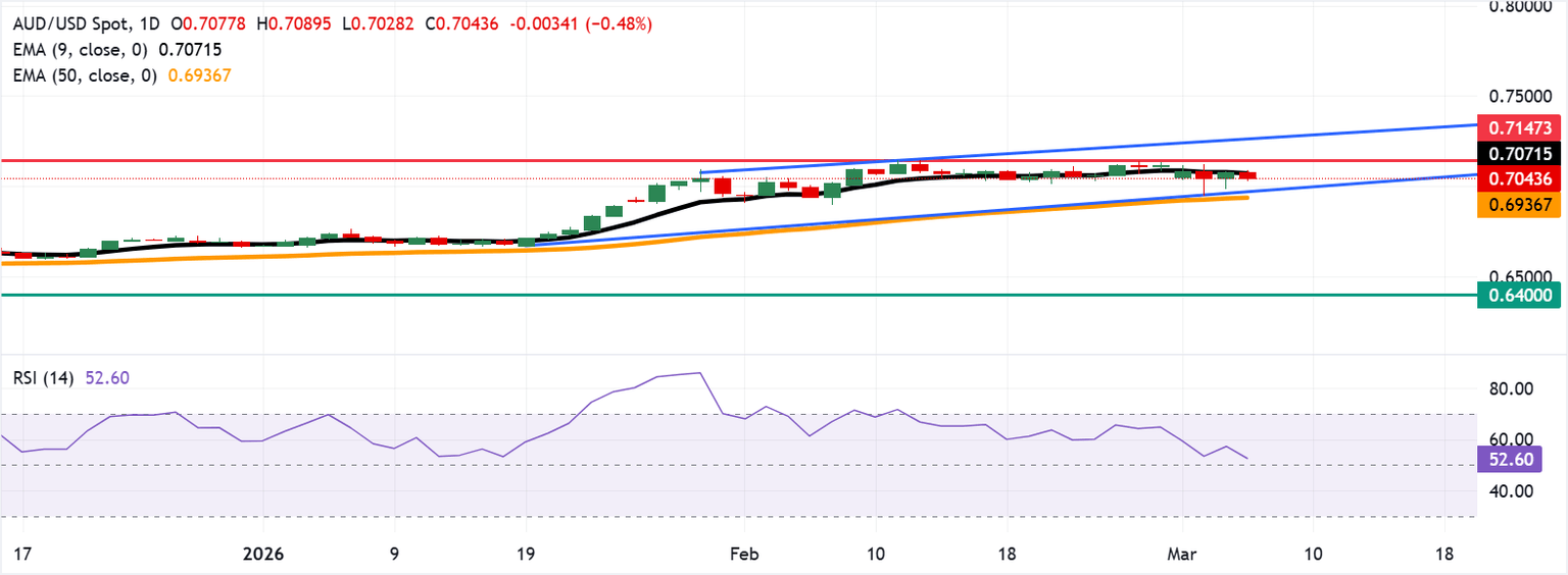 El AUD/USD recorta sus ganancias recientes de la sesión anterior, negociándose alrededor de 0.7050 durante las primeras horas europeas del jueves. El análisis técnico del gráfico diario indica que el par se mantiene dentro del patrón de canal ascendente, lo que indica que prevalece el sesgo alcista.