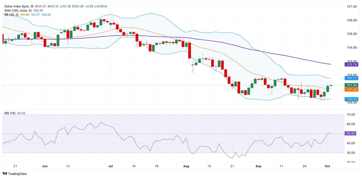 El Índice del Dólar estadounidense (DXY) extiende el rally hasta cerca de 101.25 durante la sesión europea temprana del miércoles. El estado de ánimo cauteloso en el mercado en medio de la creciente tensión en el Medio Oriente y la reducción de las expectativas de un recorte de tasas de 50 puntos básicos (pb) por parte de la Reserva Federal (Fed) en noviembre podrían apuntalar al DXY en el corto plazo.