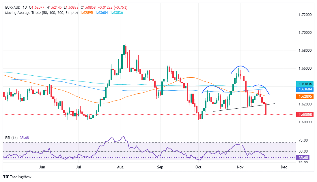 Pronóstico del precio del EUR/AUD: Caídas por debajo de 1.6100 mientras emerge el patrón de cabeza y hombros