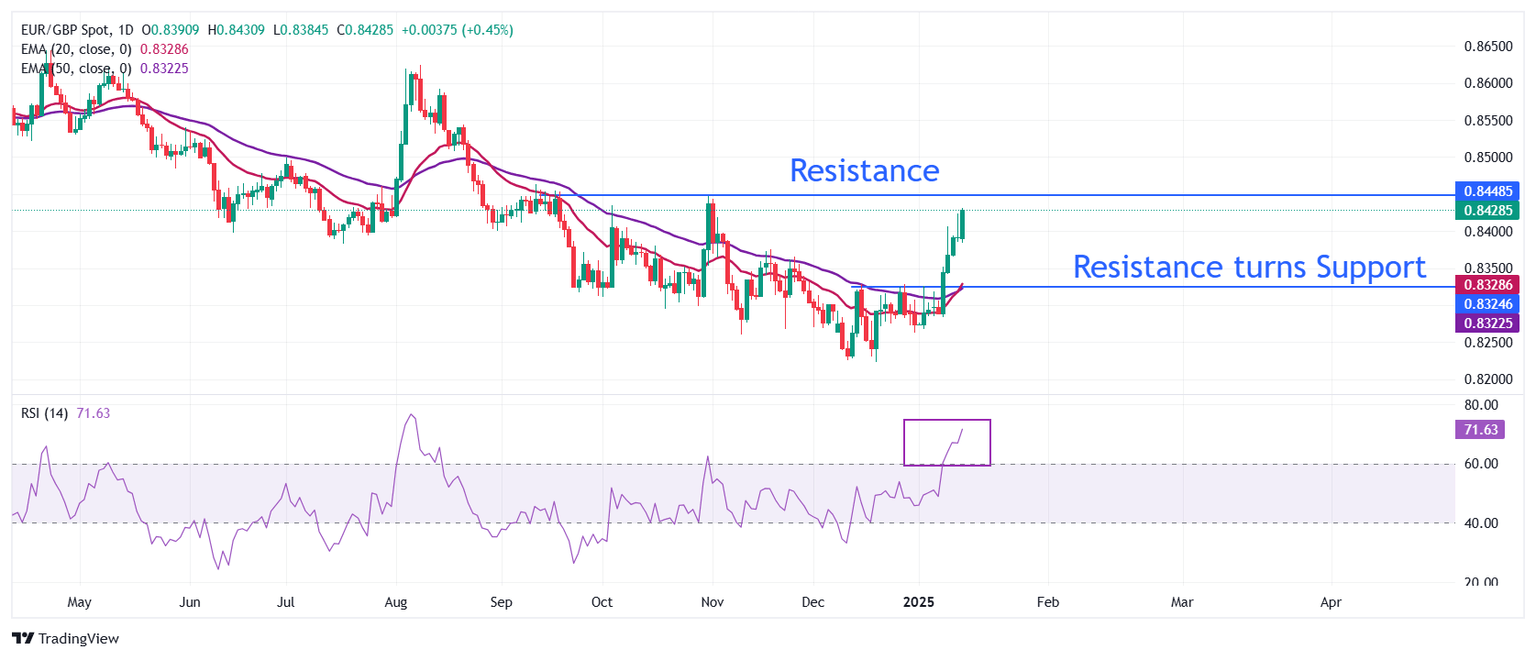 El EUR/GBP extiende su repunte semanal cerca de 0.8430. El cruce se fortaleció después de romper por encima del máximo del 27 de diciembre de 0.8329, que ahora se ha convertido en un soporte. Un cruce alcista reciente, sugerido por las medias móviles exponenciales (EMAs) de 20 y 50 días cerca de 0.8330, indica una fuerte tendencia alcista.