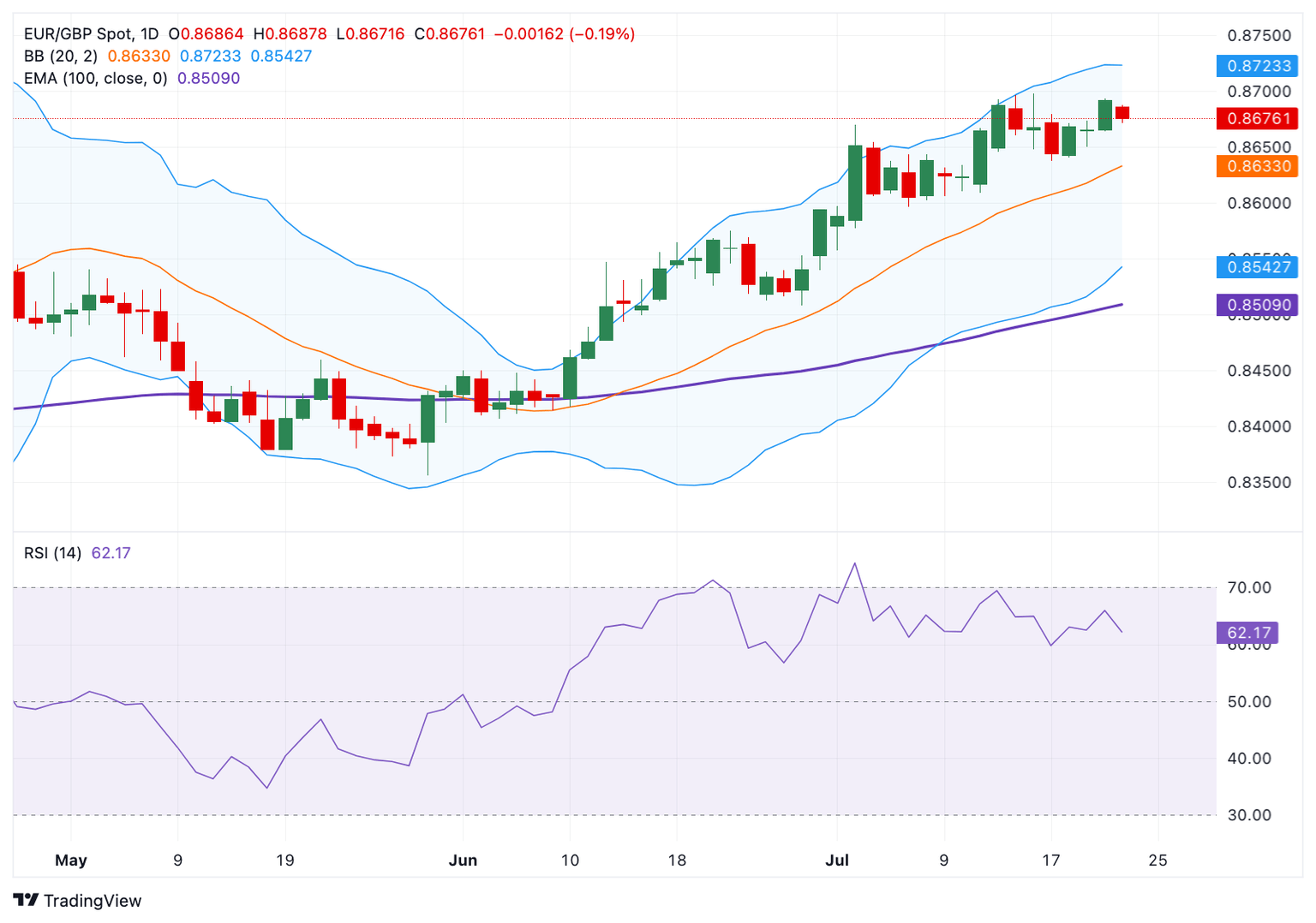 El cruce EUR/GBP atrae a algunos vendedores cerca de 0.8670 durante la sesión europea del miércoles. La renovada tensión comercial entre la Unión Europea (UE) y los Estados Unidos (EE.UU.) podría ejercer cierta presión de venta sobre el Euro (EUR). El bloque parece estar considerando si desplegar su "Instrumento Anticoerción" para intentar disuadir disputas comerciales, ya que la amenaza de un arancel del 30% sobre las importaciones de la UE se cierne sobre ellos.
