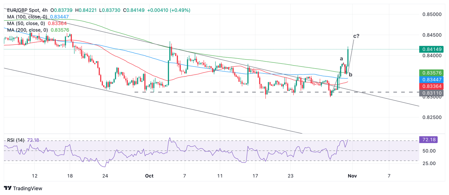 El EUR/GBP ha rebotado desde un soporte clave (línea discontinua gris) en mínimos de varios años y ha subido más de un punto porcentual para operar por encima de 0.8400 el jueves.