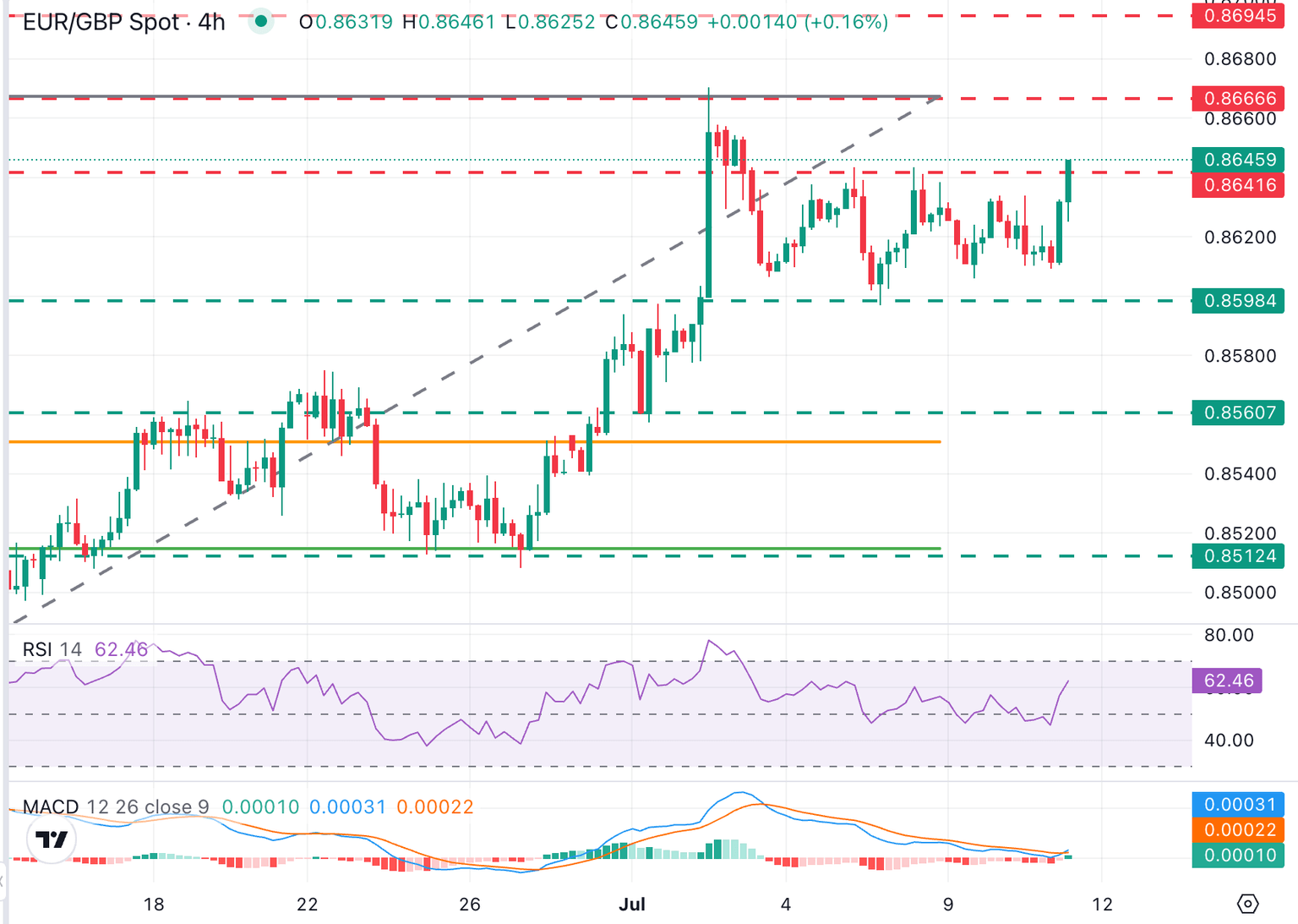 El par muestra un impulso alcista creciente después de romper la parte superior del rango de negociación de las últimas dos semanas. El Índice de Fuerza Relativa (RSI) ha cruzado por encima de 50, y el MACD también está mostrando un cruce alcista. Sin embargo, sería prudente esperar y ver si el par logra mantenerse en los niveles actuales, lo que daría a los alcistas la esperanza de una nueva prueba del máximo del 2 de julio, en 0.8665