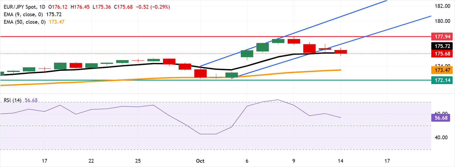 El cruce EUR/JPY puede probar la barrera inmediata en la EMA de nueve días de 175.72. Una ruptura por encima de este nivel mejoraría el momentum de precios a corto plazo y apoyaría al par para regresar dentro del canal ascendente. Este rebote reviviría el sesgo alcista y llevaría al cruce de divisas a acercarse al máximo histórico de 177.94, que se registró el 9 de octubre. Avances adicionales llevarían al cruce de divisas a probar el límite superior del canal ascendente alrededor de 180.60.