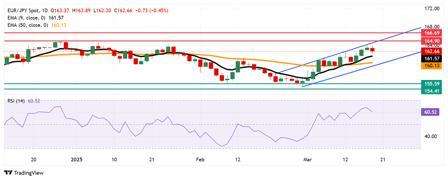 El EUR/JPY pausa su racha ganadora de tres días, flotando alrededor de 162.60 durante las primeras horas de negociación europeas del miércoles. El análisis técnico del gráfico diario sugiere que el cruce de divisas está en una tendencia alcista dentro de un canal ascendente, indicando un sesgo alcista continuo.