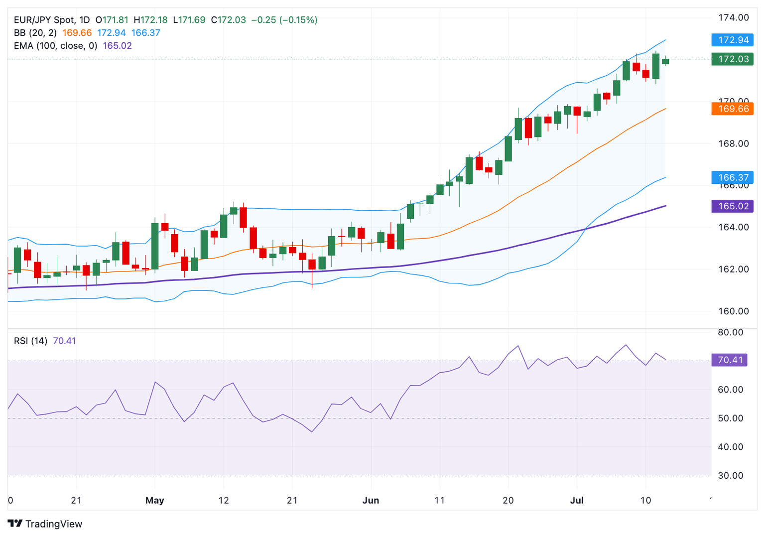 EUR/JPY Pronóstico del Precio: Perspectiva alcista se mantiene cerca de 172.00, se observa una sobrecompra en el RSI