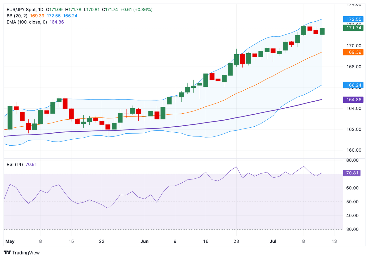 Técnicamente, el EUR/JPY mantiene la vibra alcista en el gráfico diario, con el precio manteniéndose por encima de la Media Móvil Exponencial (EMA) clave de 100 días. No obstante, el Índice de Fuerza Relativa (RSI) de 14 días se sitúa por encima de la línea media cerca de 70.50, indicando la condición de sobrecompra del RSI. Esto sugiere un impulso neutral, indicando que no se puede descartar una mayor consolidación o una venta temporal antes de posicionarse para cualquier apreciación del EUR/JPY a corto plazo.