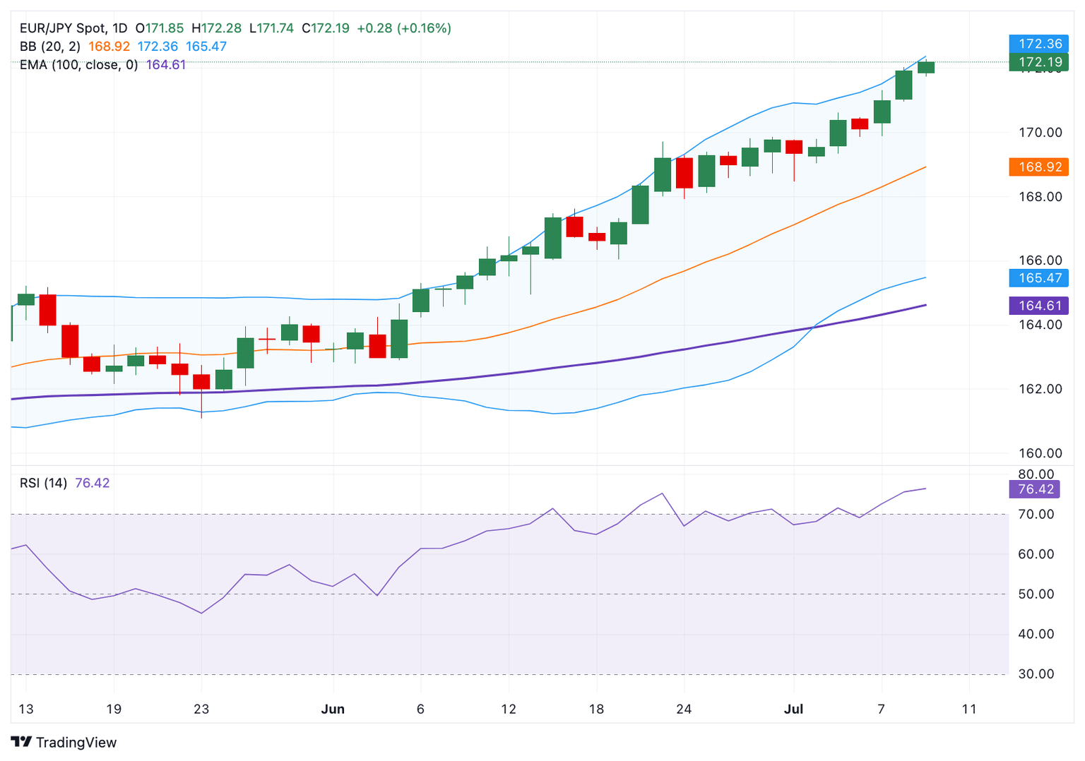 El cruce EUR/JPY extiende su alza hasta cerca de 172.20 durante la sesión europea del miércoles. El Yen japonés (JPY) se debilita frente al Euro (EUR) debido a las preocupaciones sobre las repercusiones económicas de los aranceles del 25% del presidente estadounidense Donald Trump a partir de una nueva fecha límite del 1 de agosto sobre los productos japoneses.