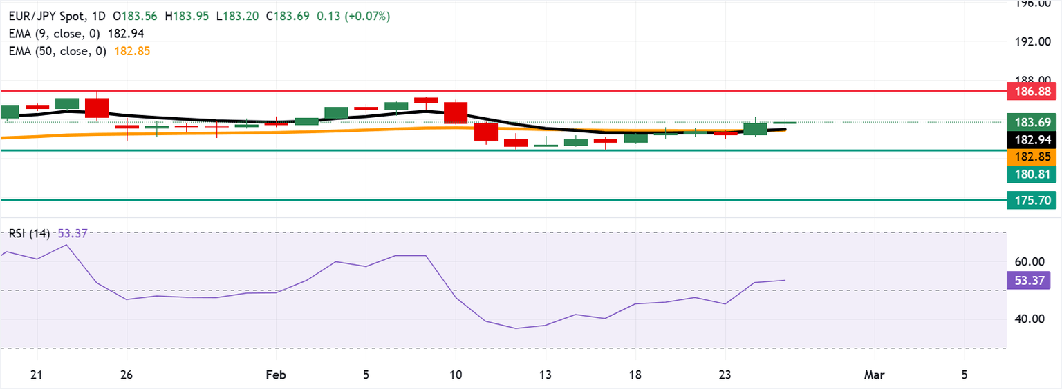 El cruce EUR/JPY mantiene un tono neutral a alcista a medida que el precio se consolida por encima de la media móvil exponencial (EMA) de 50 días, manteniendo intacta la estructura de tendencia alcista más amplia a pesar de los recientes retrocesos desde la región de 186.00. La EMA de nueve días se ha aplanado justo por debajo del nivel actual, reflejando una pérdida de impulso alcista inmediato en lugar de una clara reversión bajista.