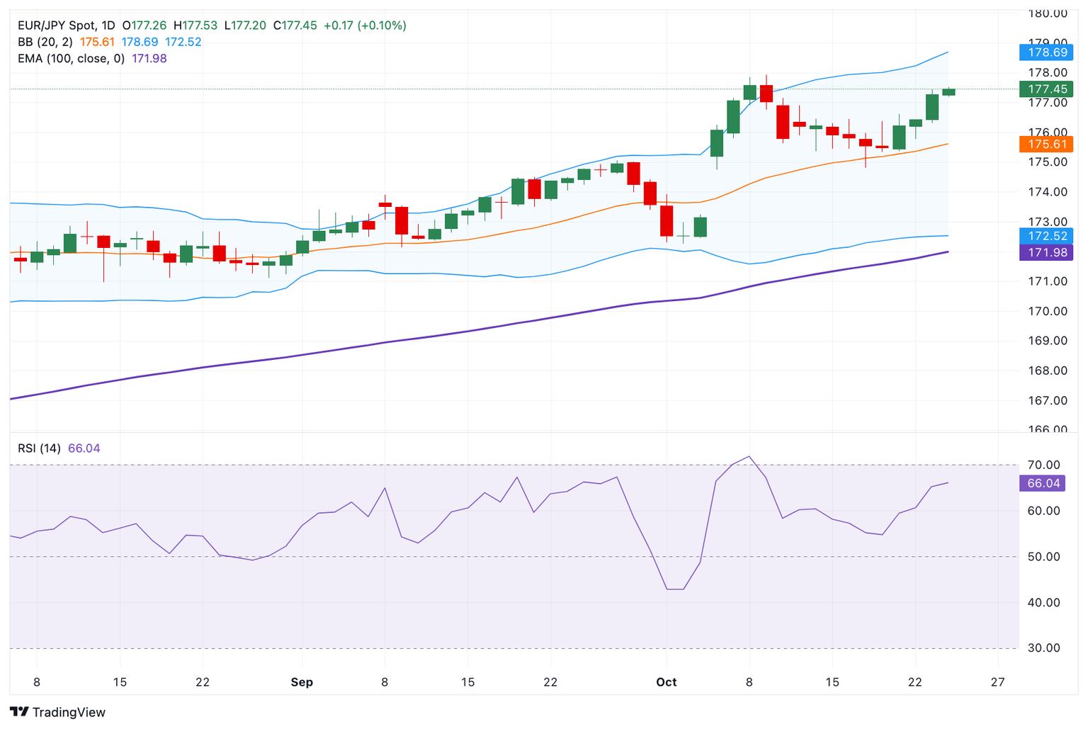 El cruce EUR/JPY cotiza en territorio positivo por cuarto día consecutivo alrededor de 177.45 durante la sesión europea del viernes. El Yen japonés (JPY) se debilita frente al Euro (EUR), incluso cuando la inflación subyacente en Japón se aceleró en septiembre por primera vez desde mayo.
