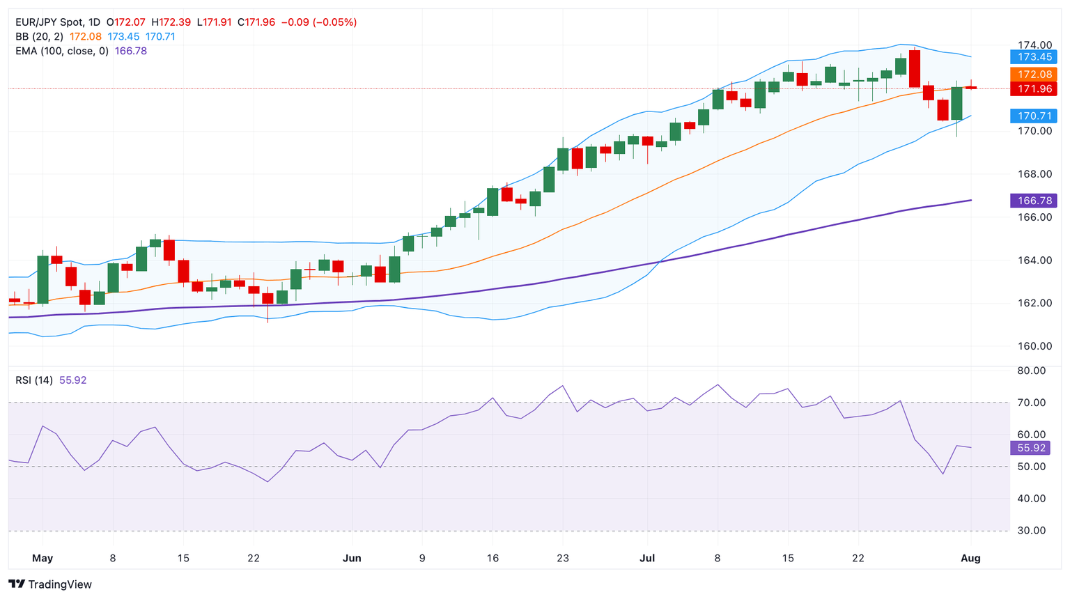 El cruce EUR/JPY opera con ligeras pérdidas cerca de 172.00 durante la sesión europea temprana del viernes. El Euro (EUR) se debilita frente al Yen japonés (JPY) en medio de la incertidumbre sobre los aranceles que rodea el acuerdo comercial entre EE.UU. y la UE.