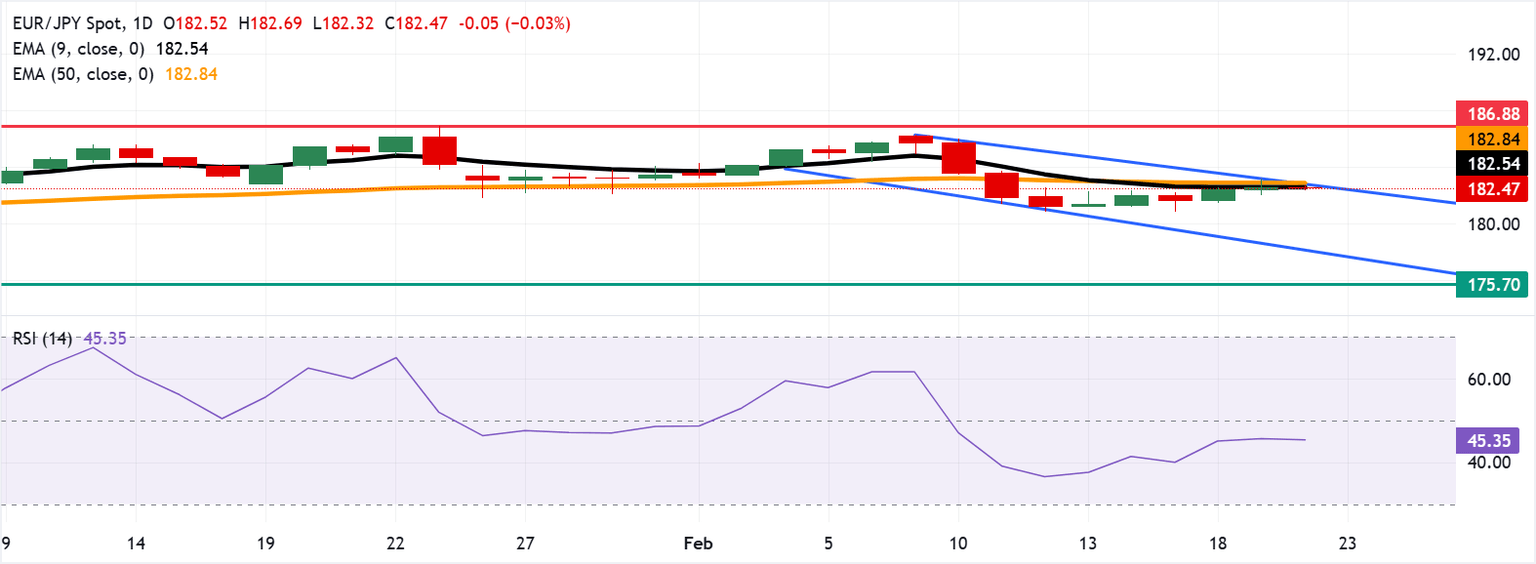 El cruce EUR/JPY está probando la zona de resistencia de confluencia en la EMA de nueve días en 182.54, seguida de la EMA de 50 días en 182.84, alineada con el límite superior del canal descendente. Una ruptura por encima de esta zona de resistencia causaría la aparición de un sesgo alcista y apoyaría al par para explorar la región alrededor del máximo histórico de 186.88, que se registró el 23 de enero.