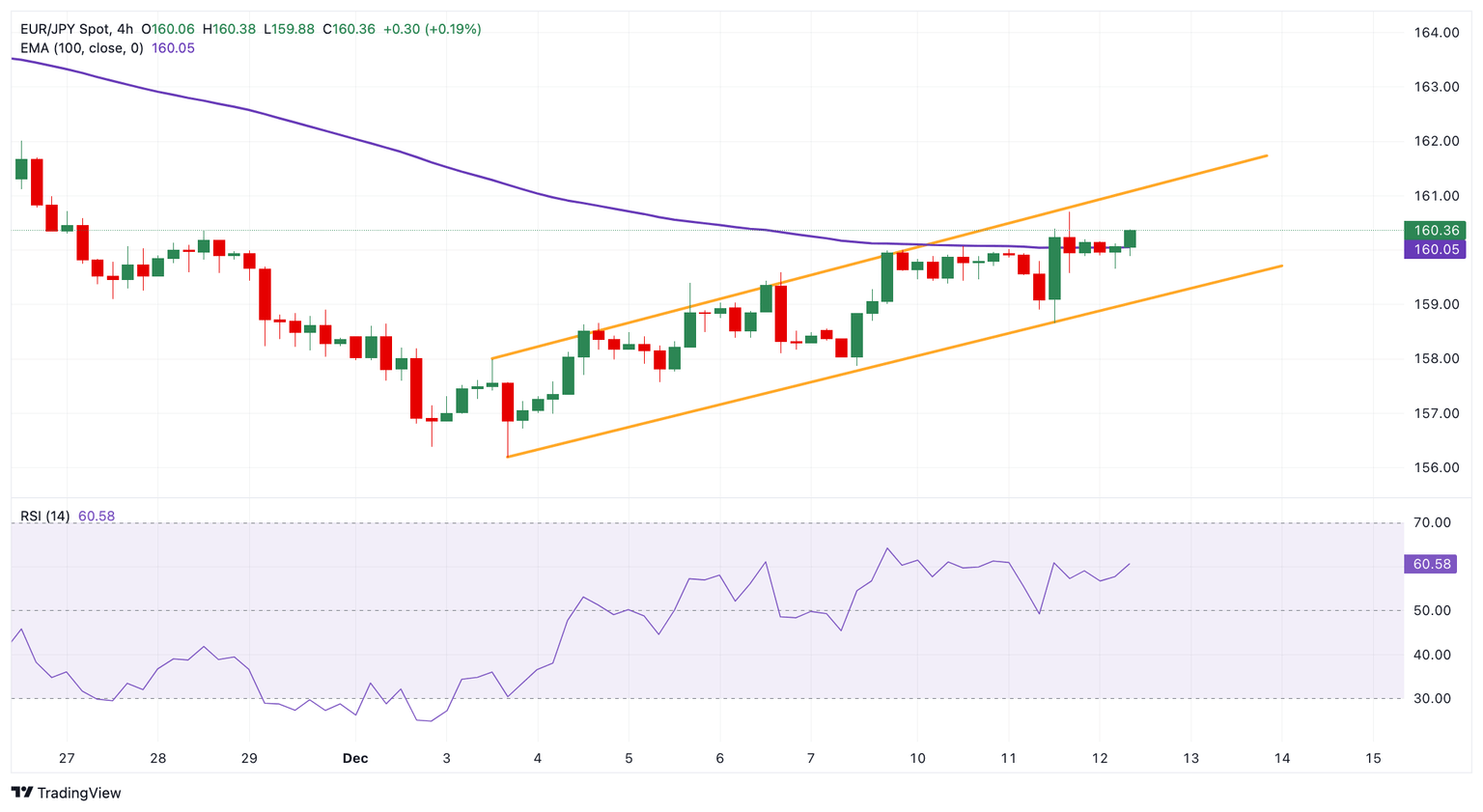 El cruce EUR/JPY cotiza en territorio positivo por cuarto día consecutivo alrededor de 160.35 durante la sesión europea del jueves. El Yen japonés (JPY) se debilita después de que Reuters informara el jueves que el Banco de Japón (BoJ) está considerando mantener las tasas de interés estables en su reunión de diciembre la próxima semana. Una fuente dijo, "Los responsables de políticas prefieren pasar más tiempo examinando los riesgos en el extranjero y las pistas sobre las perspectivas salariales del próximo año." Más tarde el jueves, los inversores seguirán de cerca la decisión de tipos de interés del Banco Central Europeo (BCE).