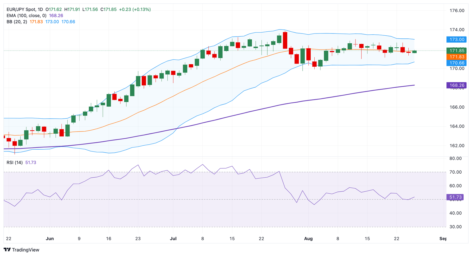 El cruce EUR/JPY gana tracción cerca de 171.85 durante los primeros compases de la sesión europea del miércoles. El Yen japonés (JPY) se debilita frente al Euro (EUR) en medio de un sentimiento de riesgo mejorado, lo que socava la moneda de refugio seguro. Los inversores esperan una serie de informes económicos que podrían dar forma a las expectativas sobre la política del Banco de Japón (BoJ). El Índice de Precios al Consumidor (IPC) de Tokio de Japón para agosto se publicará más tarde el viernes.