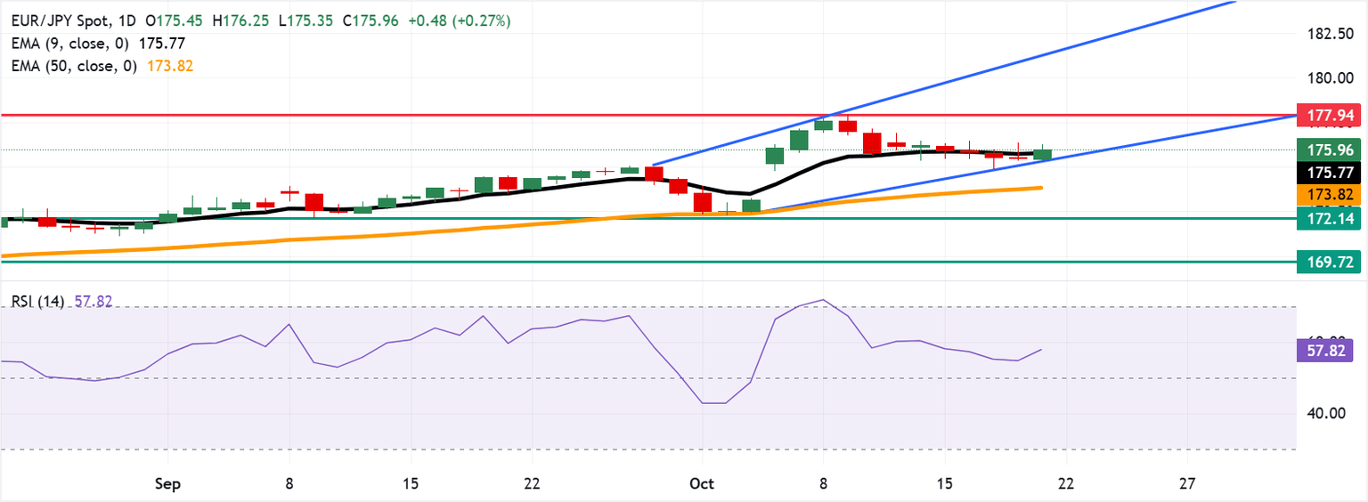 El EUR/JPY detiene su racha de pérdidas de cuatro días, cotizando alrededor de 176.00 durante las horas europeas del martes. El análisis técnico del gráfico diario indica un sesgo alcista en curso, ya que el cruce de divisas se posiciona dentro del patrón de canal ascendente.