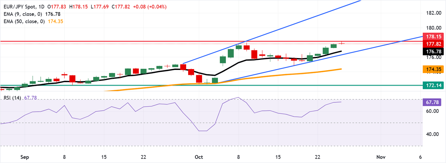 El EUR/JPY detiene su racha de cuatro días de ganancias, cotizando alrededor de 177.80 durante las horas europeas del lunes. El análisis técnico del gráfico diario indica el sesgo alcista predominante, ya que el cruce de divisas se mantiene dentro del patrón de canal ascendente.