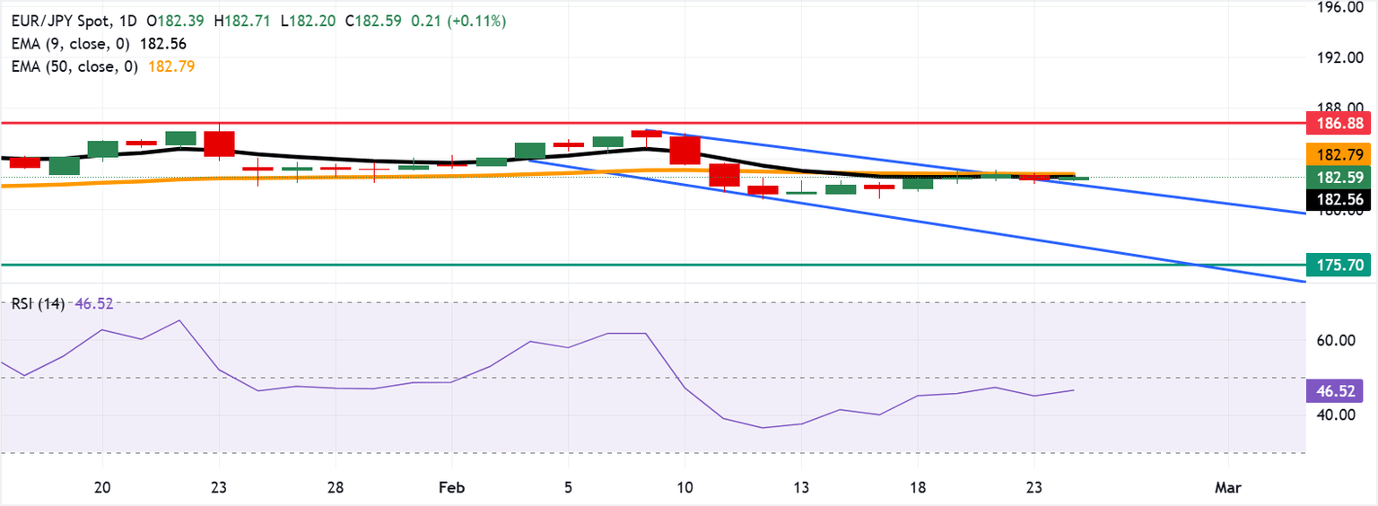 El EUR/JPY reduce sus pérdidas recientes de la sesión anterior, cotizando alrededor de 182.60 durante las horas asiáticas del martes. El análisis técnico del gráfico diario apunta a una posible reversión alcista, con el cruce de divisas manteniéndose ligeramente por encima del límite superior del patrón de canal descendente. Sin embargo, el Índice de Fuerza Relativa (RSI) de 14 días en 46.84 (neutral) señala una mejora modesta en el impulso sin una clara reanudación de la tendencia.