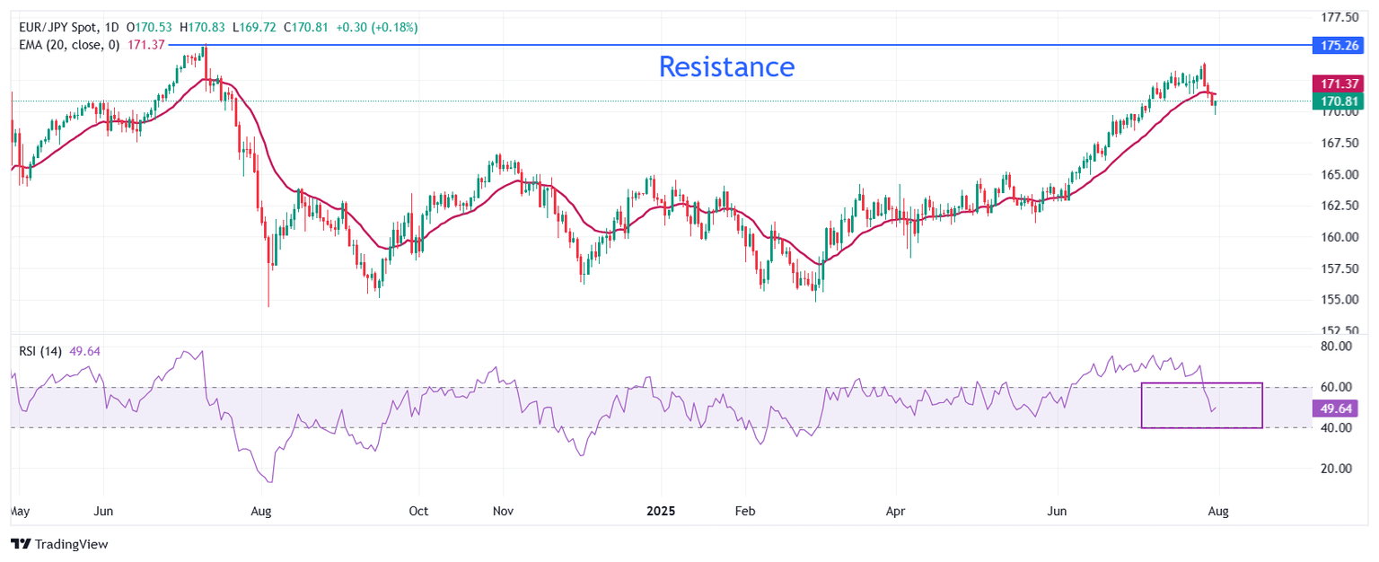 El EUR/JPY rebota con fuerza después de atraer ofertas por debajo de 170.00. Sin embargo, su tendencia a corto plazo sigue siendo incierta ya que cotiza por debajo de la media móvil exponencial (EMA) de 20 días, que está alrededor de 171.37.