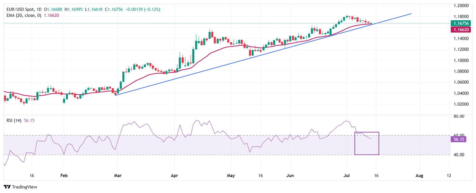 El EUR/USD corrige cerca de la línea de tendencia ascendente trazada desde el mínimo del 25 de febrero de 1.0360, trazada en un marco de tiempo diario. La media móvil exponencial (EMA) de 20 días sigue proporcionando soporte al par alrededor de 1.1660.