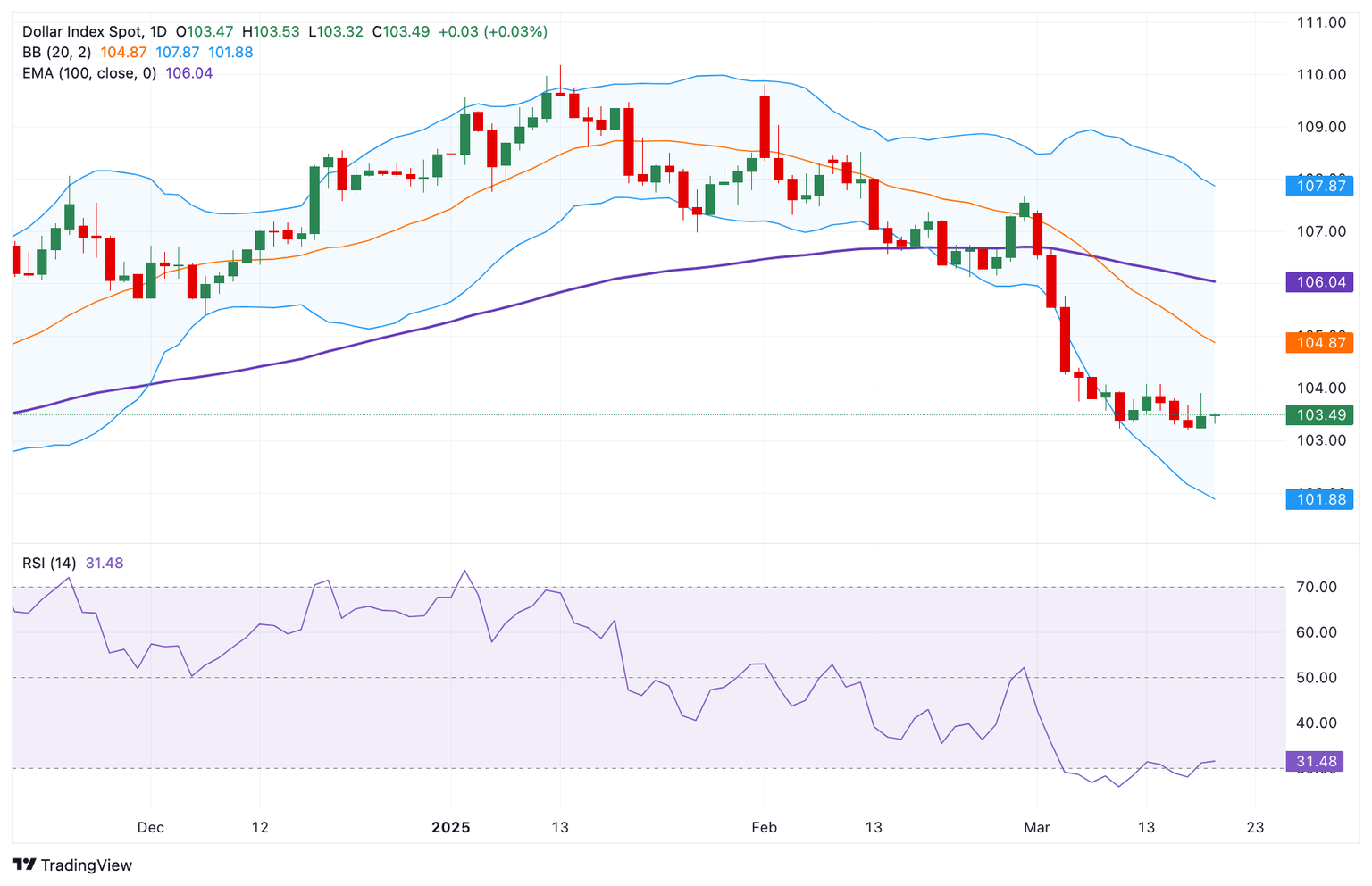 El nivel de soporte inicial para el índice USD se encuentra en 103.20, el mínimo del 18 de marzo. Un comercio sostenido por debajo del nivel mencionado podría exponer 101.88, el límite inferior de la Banda de Bollinger. Una ruptura de este nivel podría ver una caída a 100.53, el mínimo del 28 de agosto de 2024.