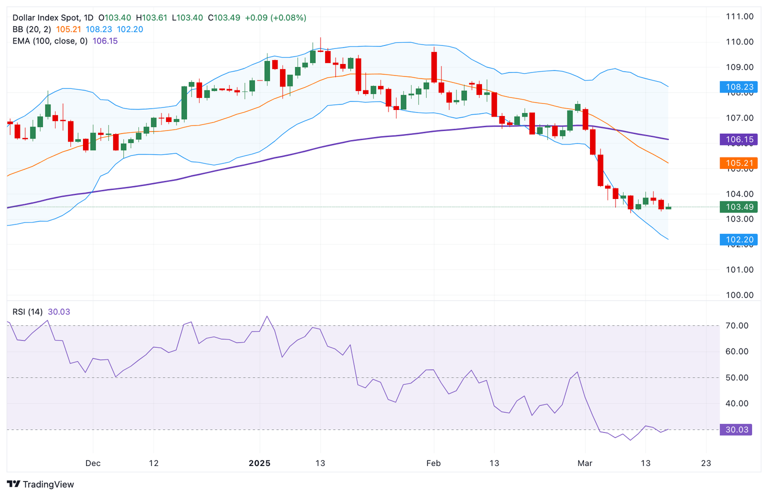 El Índice del Dólar estadounidense (DXY) recupera algo de terreno perdido cerca de 103.60 durante la sesión europea temprana del martes. El potencial alcista para el Dólar podría estar limitado en medio de temores de que las políticas arancelarias del presidente estadounidense Donald Trump podrían desencadenar una desaceleración económica más amplia.