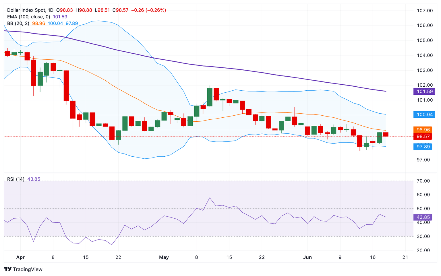El Índice del Dólar estadounidense (DXY), un índice del valor del Dólar estadounidense (USD) medido frente a una cesta de seis divisas mundiales, atrae a algunos vendedores alrededor de 98.55 durante las primeras horas de negociación en Europa el miércoles. Los operadores continúan evaluando el conflicto entre Israel e Irán antes de una decisión de la Reserva Federal (Fed) sobre las tasas de interés más tarde el miércoles.