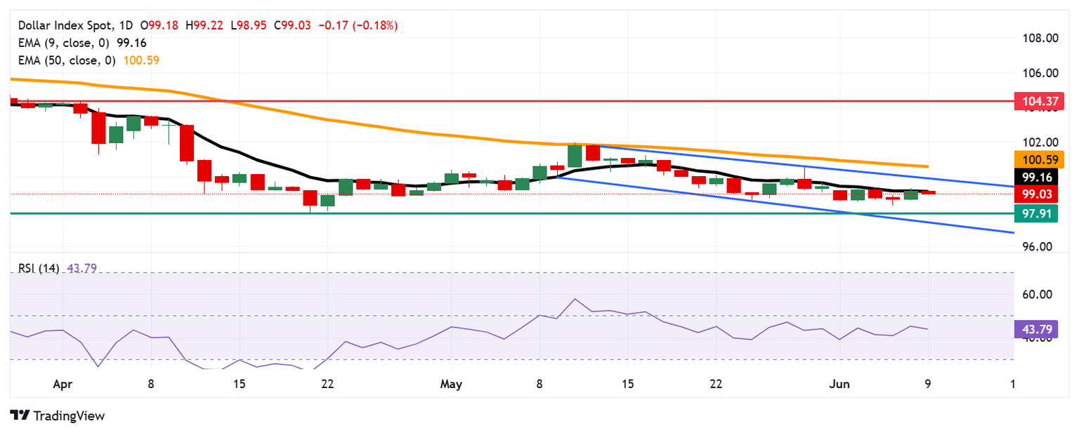 El Índice del Dólar estadounidense encuentra una barrera inmediata en la EMA de 9 días de 99.16. Una ruptura por encima de este nivel podría mejorar el momentum de precios a corto plazo y apoyar al DXY para acercarse al límite superior del canal descendente alrededor de 99.90.