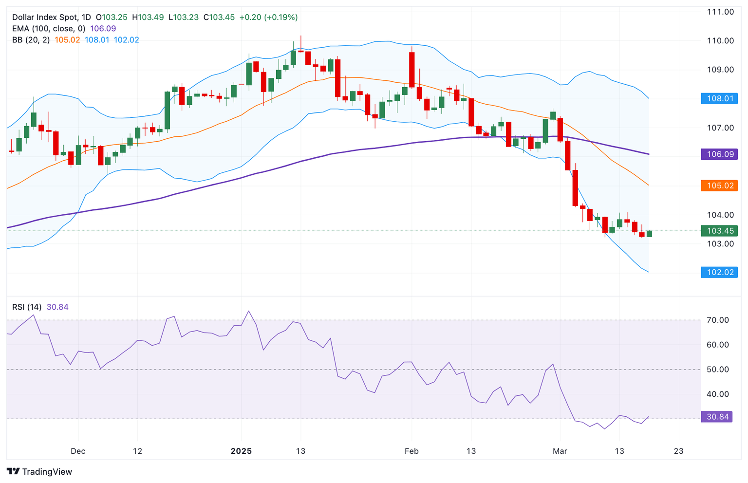 Técnicamente, la perspectiva bajista del DXY se mantiene, caracterizada por el índice manteniéndose por debajo de la clave Media Móvil Exponencial (EMA) de 100 días en el marco de tiempo diario. El camino de menor resistencia es a la baja, ya que el Índice de Fuerza Relativa (RSI) de 14 días, que se encuentra por debajo de la línea media cerca de 31.15, apoya a los vendedores en el corto plazo.