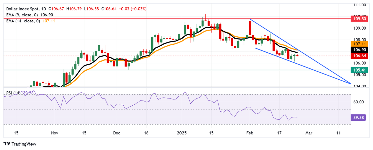 El Índice del Dólar (DXY), que mide el valor del Dólar estadounidense (USD) frente a sus seis principales pares, baja después de registrar ganancias en las dos sesiones anteriores, cotizando alrededor de 106.70 durante las primeras horas europeas del viernes. Sin embargo, el análisis del gráfico diario indica una posible reversión alcista, con el índice moviéndose dentro de un patrón de cuña descendente.