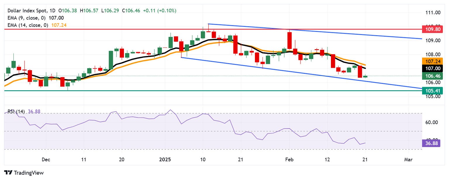 El Índice del Dólar estadounidense (DXY), que mide el valor del Dólar estadounidense (USD) frente a sus seis principales pares, mantiene su posición alrededor de 106.50 durante las primeras horas europeas del viernes. Sin embargo, el análisis del gráfico diario indica una tendencia bajista, con el índice consolidándose dentro de un patrón de canal descendente.
