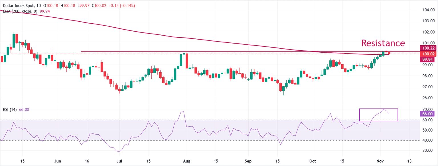 El Índice USD lucha por extender su repunte tras alcanzar un nuevo máximo de cinco meses de 100.36 registrado el jueves. El activo se esfuerza por estabilizarse por encima de la Media Móvil Exponencial (EMA) de 200 días, que opera alrededor de 99.94.