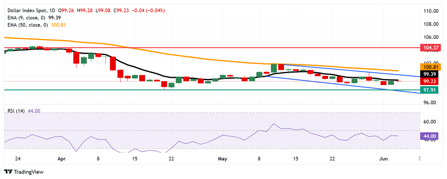 En el gráfico diario, el análisis técnico sugiere un sesgo bajista persistente, con el índice consolidándose dentro de un patrón de canal descendente. El DXY se mantiene por debajo de la media móvil exponencial (EMA) de nueve días, lo que indica que el impulso a corto plazo es más débil. Además, el Índice de Fuerza Relativa (RSI) de 14 días está posicionado por debajo del nivel 50, indicando el sesgo bajista predominante.