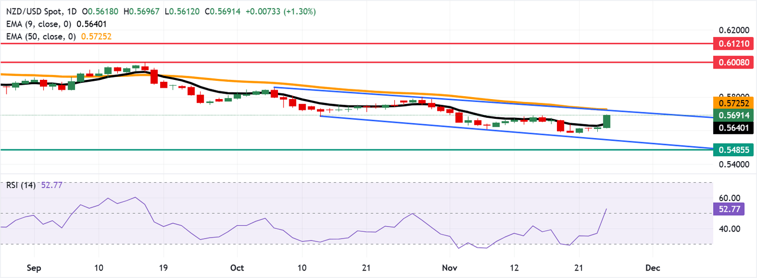 El NZD/USD se negocia al alza en más del 1%, cotizando alrededor de 0.5690 durante las horas asiáticas del miércoles. El análisis técnico del gráfico diario señala un sesgo bajista persistente, ya que el precio del par se mantiene dentro del patrón de canal descendente.