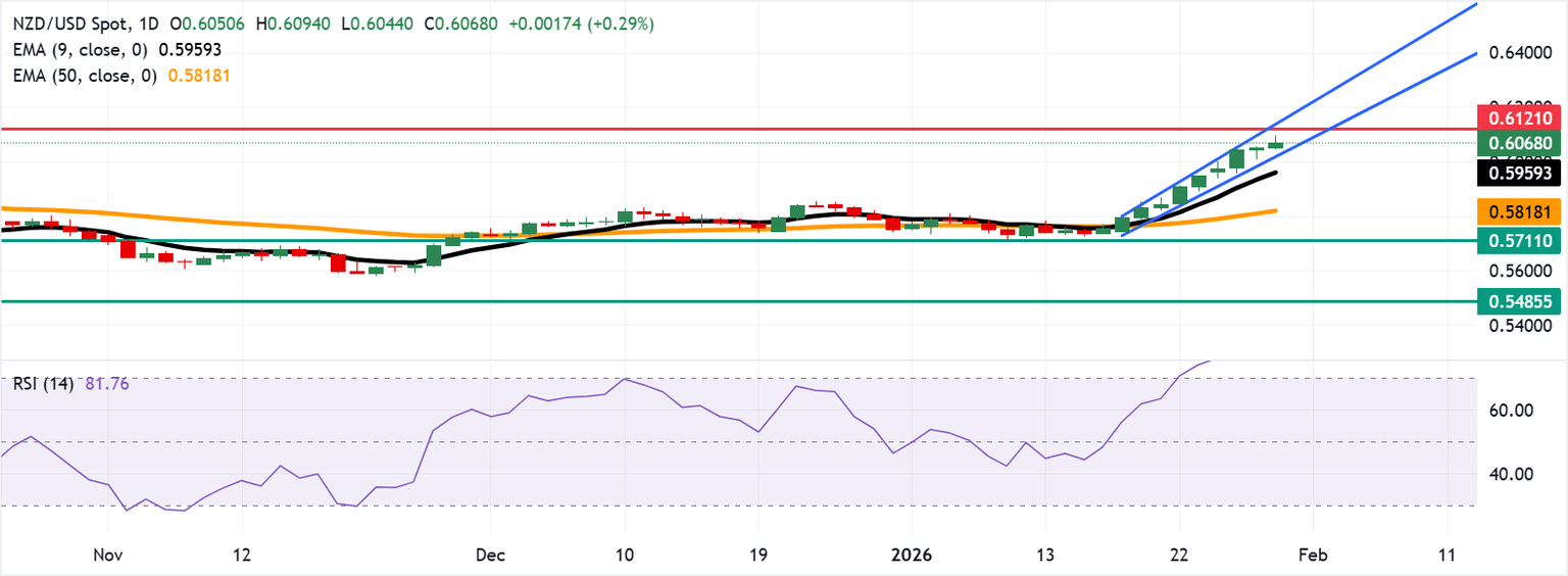El NZD/USD continúa su racha ganadora que comenzó el 16 de enero, cotizando alrededor de 0.6080 durante las horas europeas del jueves. El análisis técnico del gráfico diario señala un sesgo alcista persistente a medida que el precio del par sube dentro del patrón del canal ascendente.