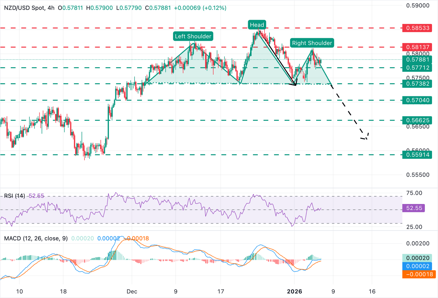 - El rechazo del Dólar neozelandés en 0.5800 ha impreso el hombro izquierdo de un potencial patrón de Hombros -Cabeza-Hombros.